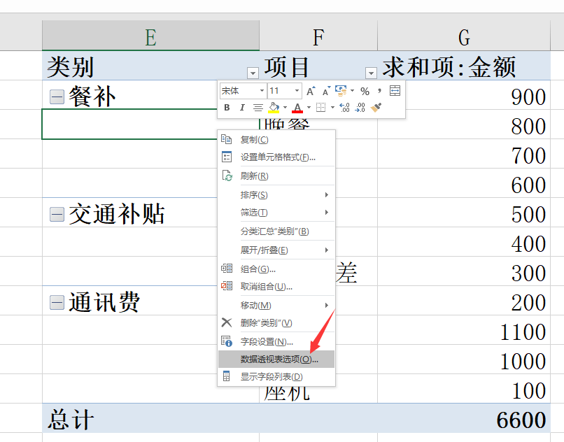 メ将类别,项目拉到行字段,金额拖动到值字段,点击透视表——设计——不显示分类汇总。メ