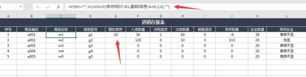 库存表函数自动生成,下拉菜单选择产品代码,手动期初,安全库存,自动库存提醒。